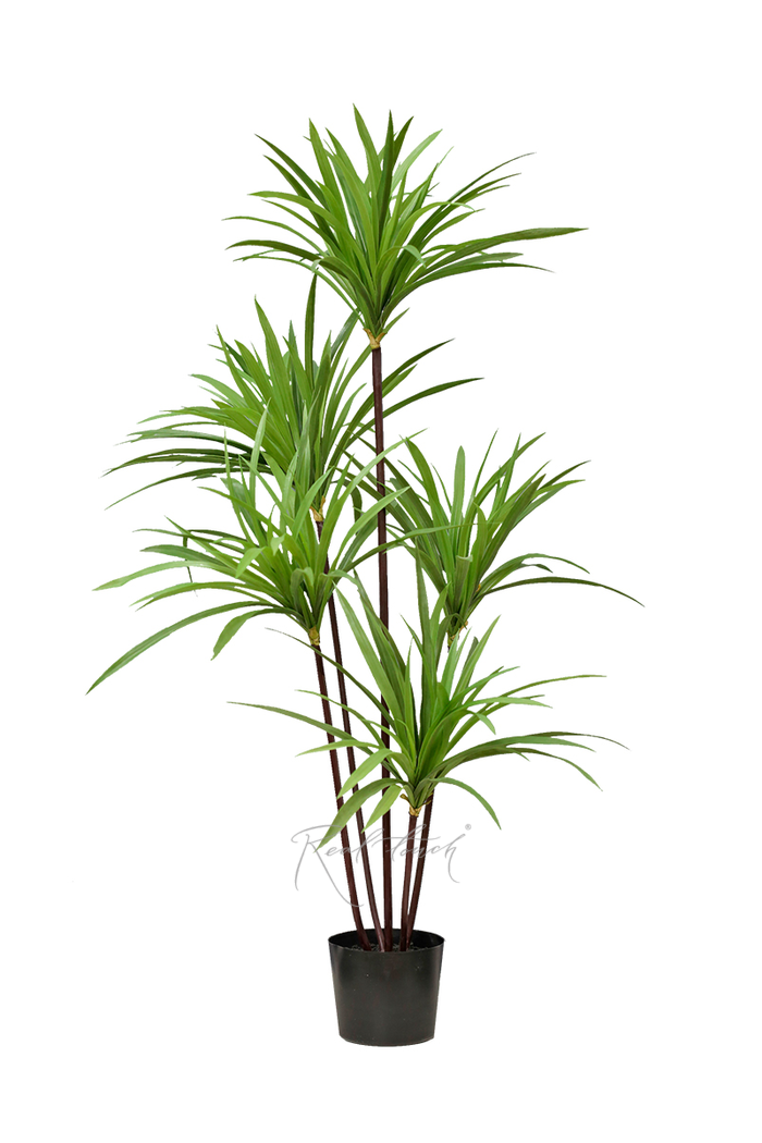 Утонченная, но в то же время пышная драцена - такое впечатление создается благодаря тонким коричневым стеблям разной высоты, которые венчаются "шапками" из множества узких зеленых листьев. Стебли можно раздвинуть, чтобы создать еще больший объем. Между стеблями и листьями есть желтая окантовка, имитирующая опавшие сухие листочки. Листья сделаны из мягкого пластика. Драцены идут в технических кашпо и представлены в 3-х размерах: 120, 150 и 180 см.