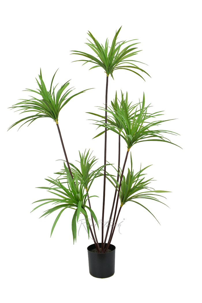 Утонченная, но в то же время пышная драцена - такое впечатление создается благодаря тонким коричневым стеблям разной высоты, которые венчаются "шапками" из множества узких зеленых листьев. Стебли можно раздвинуть, чтобы создать еще больший объем. Между стеблями и листьями есть желтая окантовка, имитирующая опавшие сухие листочки. Листья сделаны из мягкого пластика. Драцены идут в технических кашпо и представлены в 3-х размерах: 120, 150 и 180 см.