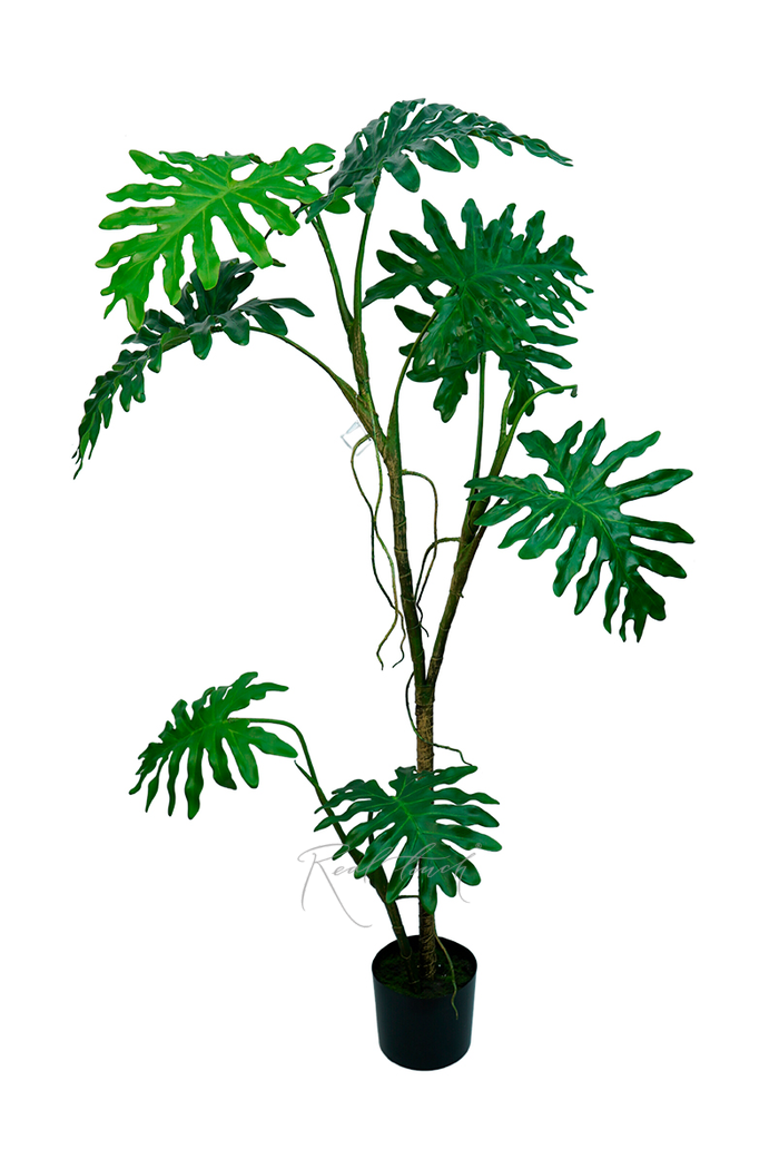 Данное растение имеет полностью аналогичное строение с монстерой лиана, отличается только формой листа. То есть есть трех размеров 130см (2 ствола, 7 листов), 168см (9 листов), 200см (2 ствола, 12 листов). Материал - водонепроницаемое полотно с минимальной формовкой листа. Лист односторонний, у него есть обратная техническая сторона с усилителем, поэтому нужно хорошо расправить при установке. Ствол из пластика, приятный на ощупь и реалистичный визуально. Лист не просто идет тонким стеблем, а будто в основании обнимает ствол и только потом утончается, превращаясь в стебель, переходящий в широкий лист. В живой природе растут они как в лесах, так и в болотистой местности, на побережьях рек, вдоль дорог. А благодаря своим воздушным корням могут взбираться на другие растения и деревья. Именно эти корни мы видим у нашей монстеры и филодендрона. За свое поведение они и получили название, которое с древнегреческого языка переводится как «люблю дерево».