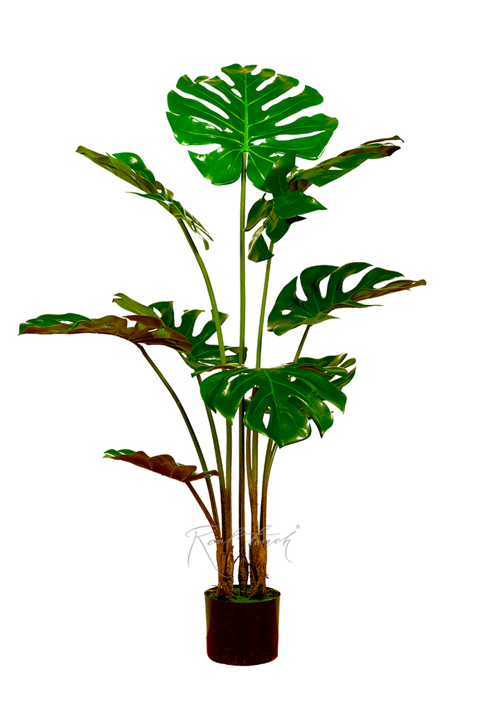 Монстера пришла двух форматов. Первый вид, это куст монтеры 3-х размеров: 100, 120, 135см, в зависимости то того, как будет выгнут верхний лист, она может быть выше или ниже. Листья растут из общего основания. Материал - водонепроницаемое полотно с минимальной формовкой листа. Стебли сделаны из пластика, внутри них проволока, которая уходит и в лист, в основании куста есть корешки, что делает монстеру еще более реалистичной. Кроме размера, монстера отличается еще и количеством листьев: 100см - 7 листов, 120см - 9 листов, 135см - 12 листов. Кустики подойдут в разные интерьеры, их можно использовать отдельно, группой или как составную часть объекта в тропическом стиле, дополнив вторым видом монстеры.