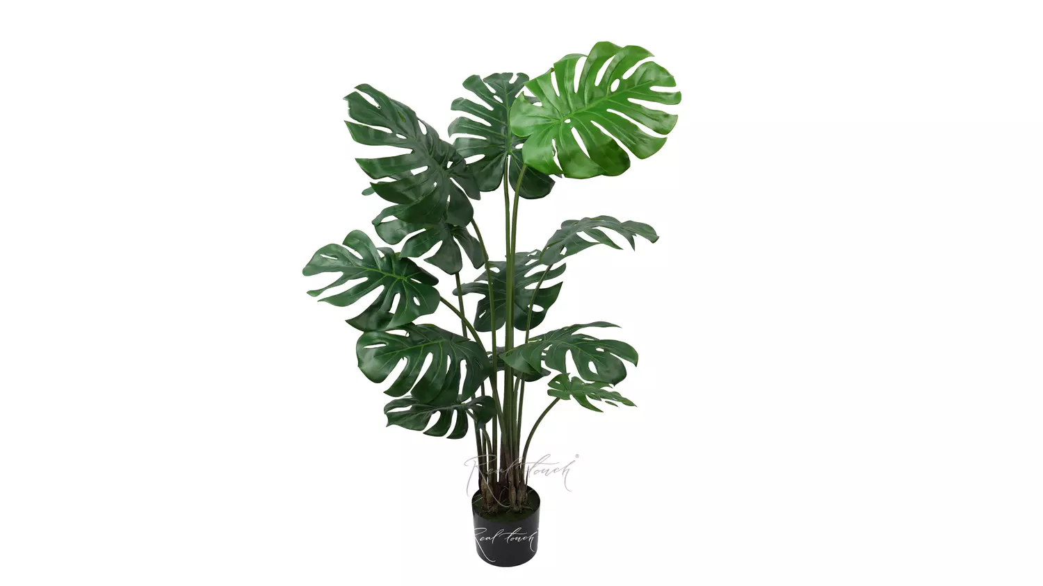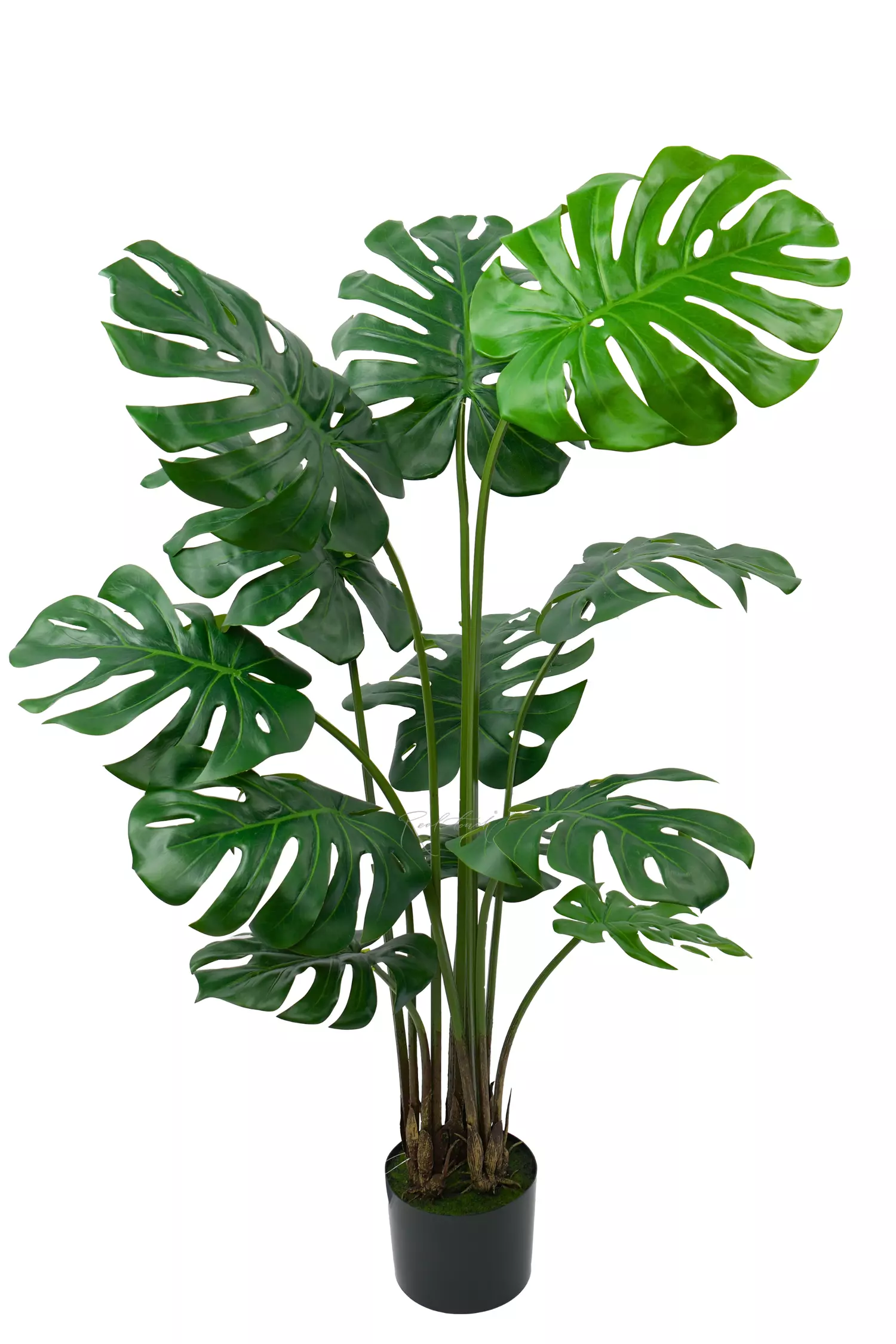 Монстера пришла двух форматов. Первый вид, это куст монтеры 3-х размеров: 100, 120, 135см, в зависимости то того, как будет выгнут верхний лист, она может быть выше или ниже. Листья растут из общего основания. Материал - водонепроницаемое полотно с минимальной формовкой листа. Стебли сделаны из пластика, внутри них проволока, которая уходит и в лист, в основании куста есть корешки, что делает монстеру еще более реалистичной. Кроме размера, монстера отличается еще и количеством листьев: 100см - 7 листов, 120см - 9 листов, 135см - 12 листов. Кустики подойдут в разные интерьеры, их можно использовать отдельно, группой или как составную часть объекта в тропическом стиле, дополнив вторым видом монстеры.