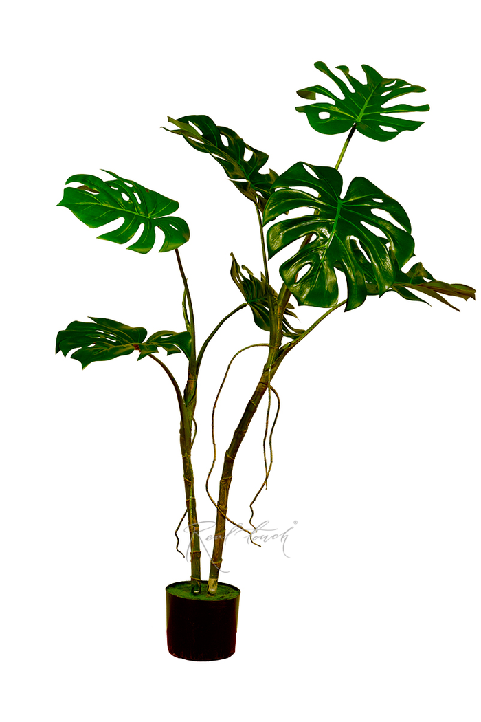 Второй вид куст монстеры - это монтера лиана. От первого вида она отличается строением: один или два ствола, в зависимости от размера, со свисающими воздушными корнями. Данный вид есть трех размеров 130см (2 ствола, 7 листов), 168см (9 листов), 200см (2 ствола, 12 листов). Материал - водонепроницаемое полотно с формовкой листа. Лист односторонний, у него есть обратная техническая сторона с усилителем, поэтому нужно хорошо расправить при установке. Ствол пластиковый, но при этом приятный на ощупь и визуально невероятно реалистичный. Лист не просто идет тонким стеблем, а будто в основании обнимает ствол и только потом утончается, превращаясь в стебель, переходящий в широкий лист. Очень изящное, необычное и привлекательное растение., которое подойдет для декора ресторанов, фитнес-центров, офисов и даже дома он дополнит интерьер и не будет скрадывать пространство.