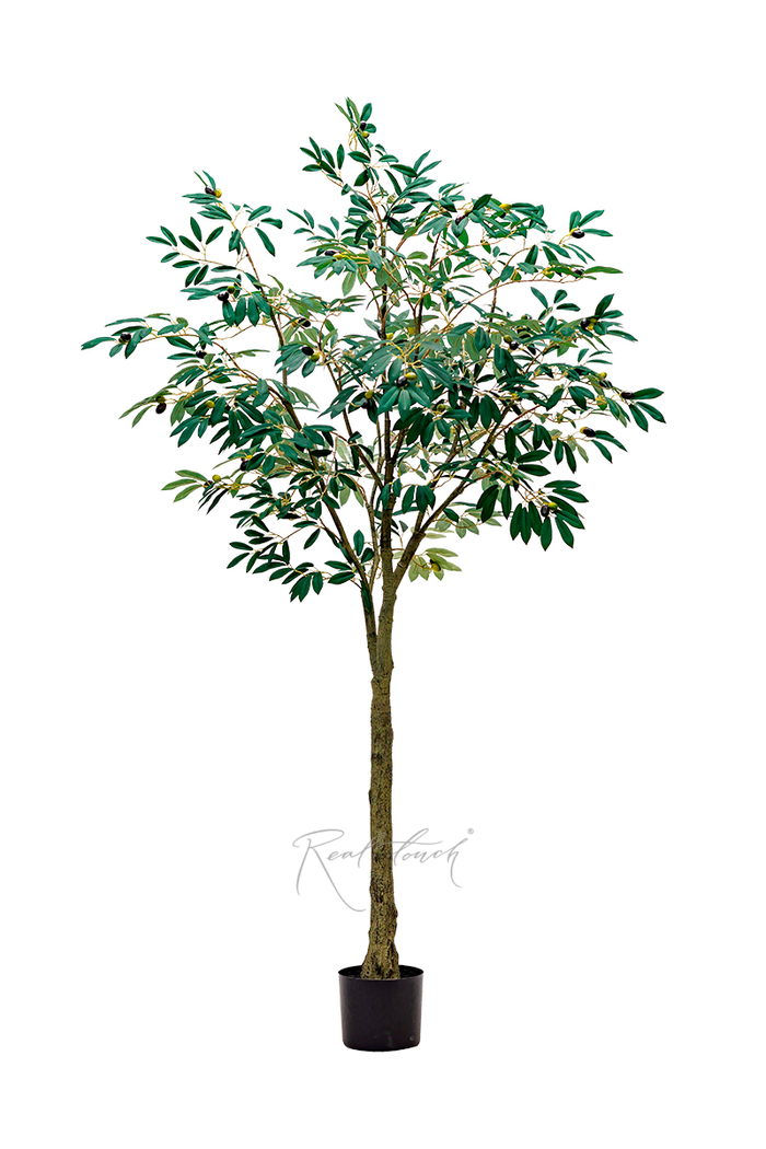 У нашей оливы листья небольшие, без печати, легкие темно-зеленого цвета, среди них прячутся плоды зеленого и черно-коричневого цветов. Веточки гнутся от самого основания, чем ближе к листьям, тем тоньше и менее управляемые, что делает их более реалистичными особенно при наличии легкого ветерка, когда крона приходит в движение, танцуя. Ствол изящный не контрастный с оливковым оттенком. На ощупь шершавый и прохладный. Олива представлена в трех размерах 180/210/240см.