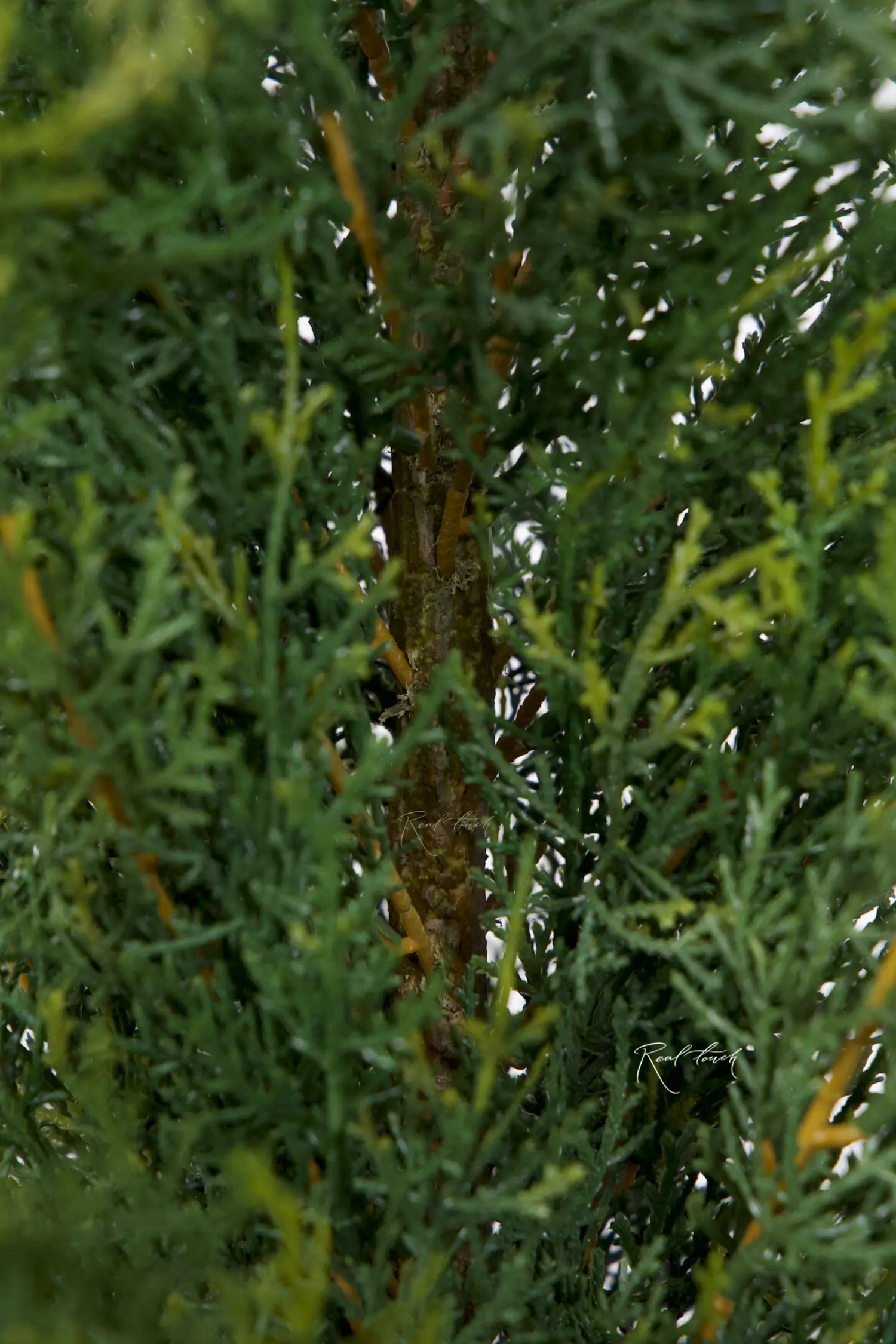 Западная туя из пластика представлена в трех размерах 210/180/150см. Крона имеет узкую пирамидальную форму, из-под которой видно тонкий ствол серо-коричневого цвета. Чешуевидная хвоя густая, яркая и блестящая, имеет переход цвета от темно-зеленого к светло-зеленому на кончиках, как у настоящего дерева. В материал хвои добавлено вещество, препятствующее воздействию ультрафиолетовых излучений и защищающее цвет от выгорания, что продлевает срок эксплуатации на улице. Доступны поштучно. Гармонично смотрятся набором.