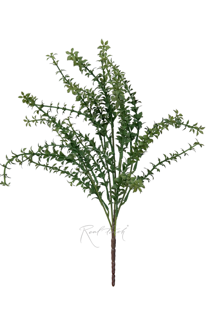 Искусственный тимьян темно-зеленый — это изысканное декоративное растение, созданное для украшения интерьера. Его темно-зеленые листья имеют насыщенный оттенок, который гармонично вписывается в любой стиль оформления. Тимьян идеально подходит для создания композиций в горшках, кашпо или вазах. Он может использоваться как самостоятельный элемент декора или в сочетании с другими искусственными растениями. Компактные размеры и легкость конструкции делают его удобным для размещения на полках, столах или подоконниках.Это декоративное растение не требует ухода, полива или особого освещения, что делает его практичным выбором для занятых людей. Тимьян станет стильным акцентом в вашем доме, добавляя свежести и природной гармонии в интерьер.