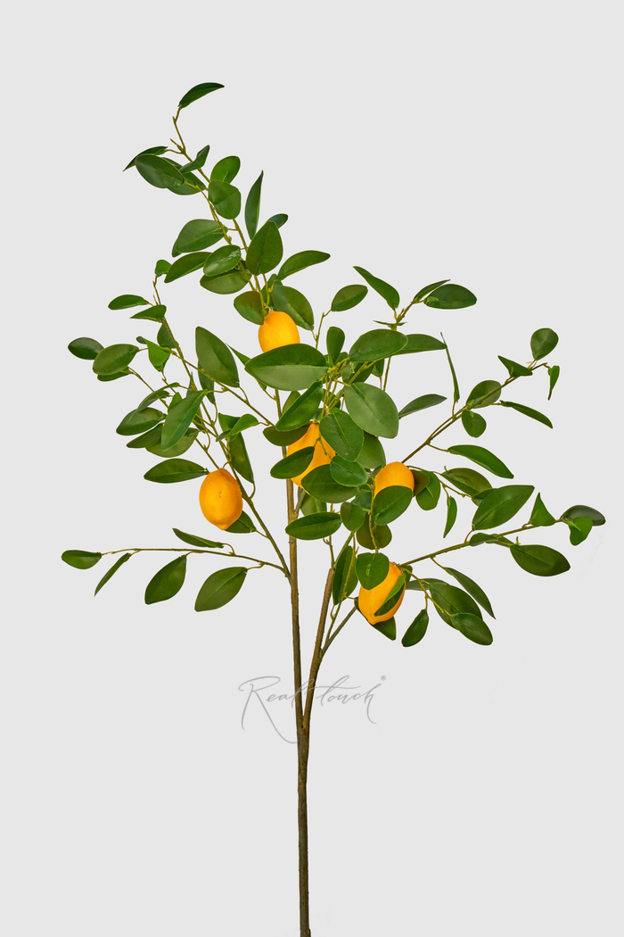 Ветка лимона с плодами в ассортименте в двух размерах 94 и 135см. Веточки очень объемные с темной листвой и крупными плодами сочного жёлтого цвета. Листики гладкие из водонепроницаемого полотна темно-зеленого цвета аккуратные овальной формы. В веточках есть проволока, поэтому их можно отогнуть и расправить ветку, сделать ее объемной. Сами лимоны гладкие с легкой бугристостью, легкие и яркие. Они станут прекрасным акцентом в интерьере и сохранят свою свежесть и яркость годами, не теряя цвет и форму.