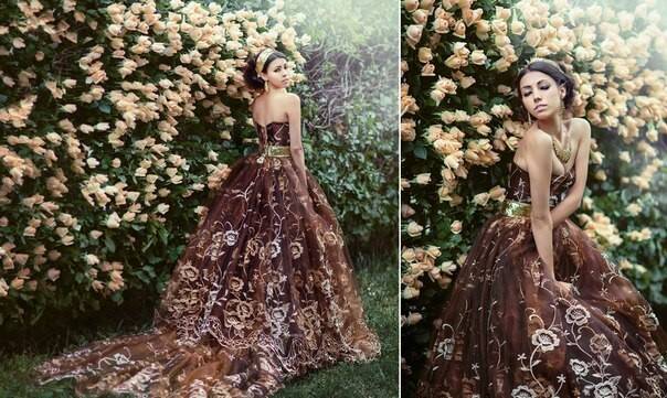 Шикарная стена из кремовых роз REALTOUCH, роскошное платье с золотыми цветами и модель Алина Бурдина помогли создать арт-фотографу Марине Липиной осенний образ Цветочной Феи.