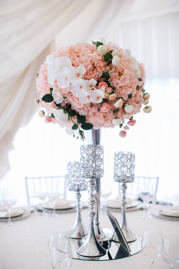 - композиции на столы из гортензий, орхидей, роз и ранункулюсов