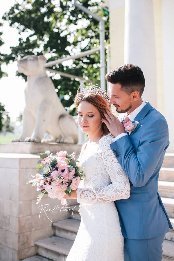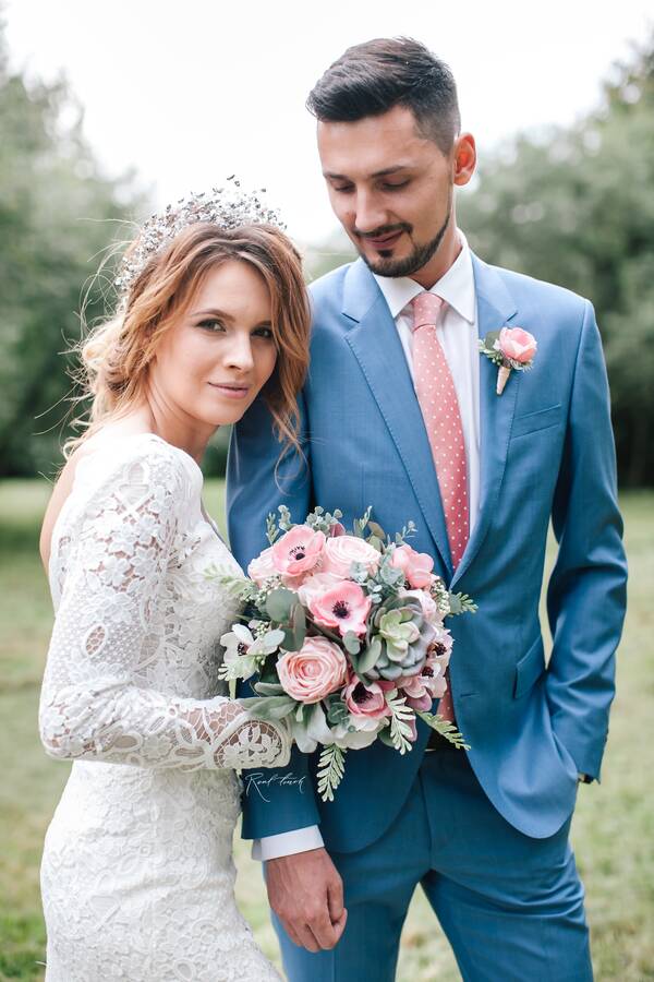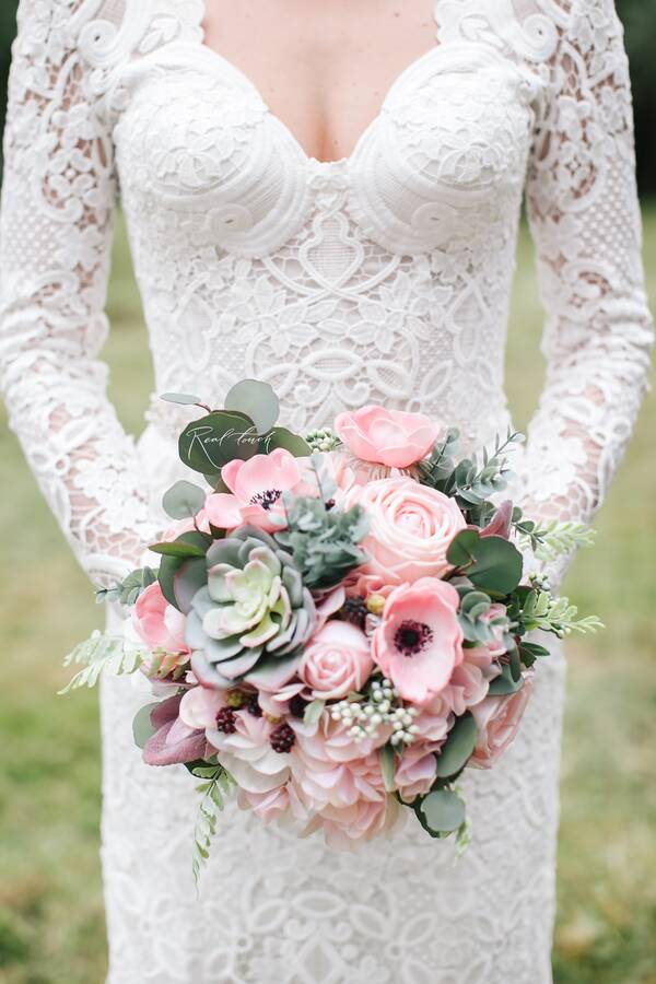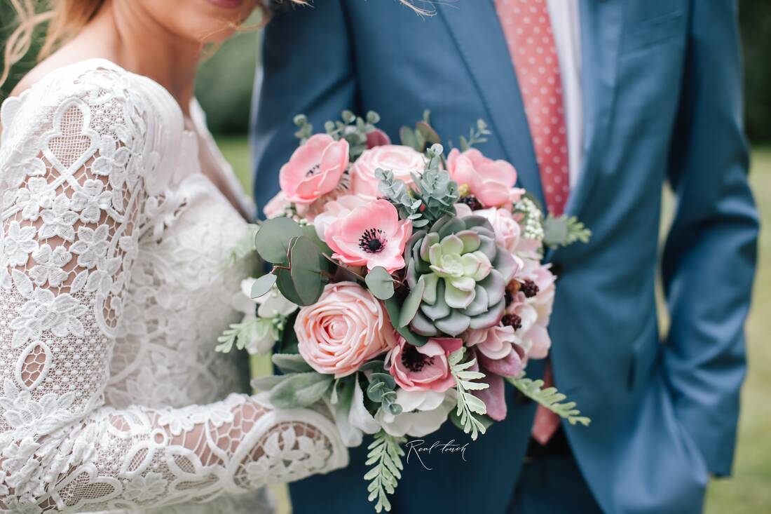 - букет невесты и дублер букета невесты из анемон, роз, эвкалипта, душистого горошка, стахиса и суккулента (основной букет сделан полностью из цветов и растений от компании Real Touch, а в дублере были также использованы живые цветы и растения)