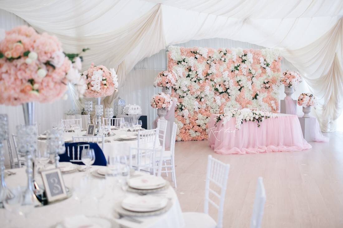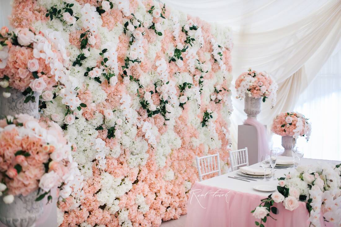 - стена из гортензий, орхидей и роз из силикона и латекса размером 3×2,5 м